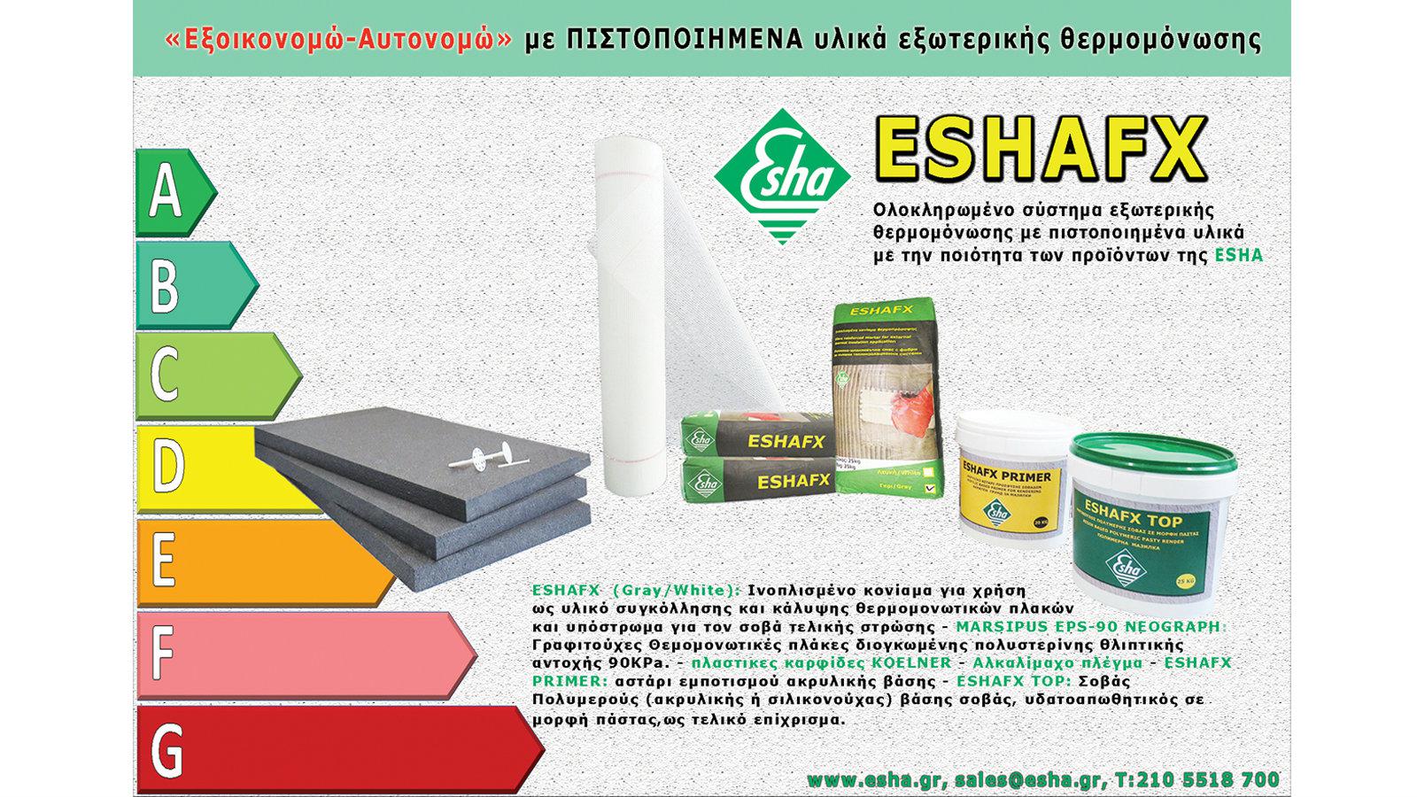 ESHAFX: τσιμεντοειδούς βάσης, ινοπλισμένο κονίαμα, ενισχυμένο με πολυμερή (ρητίνες) που χρησιμοποιείται ως υλικό συγκόλλησης θερμομονωτικών πλακών (αφρώδη & ινώδη) σε διάφορα υποστρώματα. Χρησιμοποιείται επίσης σαν αντιρηγματώδης σοβάς είτε για επικάλυψη θερμομονωτικών υλικών είτε απλής τοιχοποιίας με χρήση κατάλληλου αλκαλίμαχου υαλοπλέγματος. Αποτελεί υπόστρωμα για τον σοβά τελικής στρώσης σε εφαρμογές εξωτερικής θερμομόνωσης. Διατίθεται σε γκρι απόχρωση με την εμπορική ονομασία ESHAFX GRAY & σε λευκή απόχρωση με την εμπορική ονομασία ESHAFX WHITE