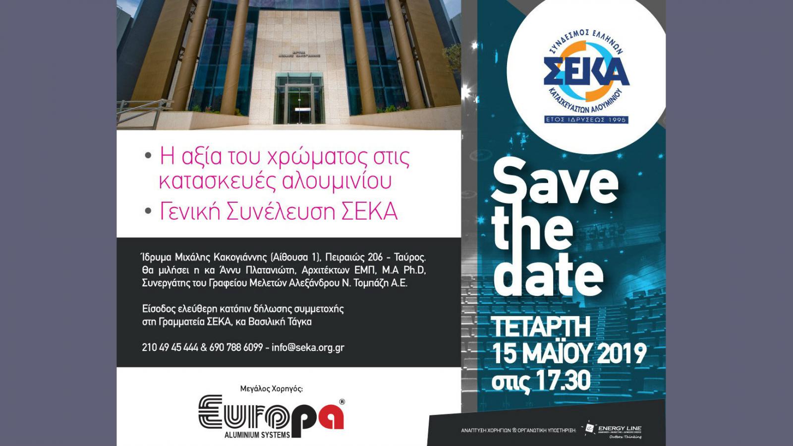 Η EUROPA στα πλαίσια της στήριξης του ετήσιου προγράμματος του ΣΕΚΑ, συμμετέχει ως μεγάλος χορηγός στην εσπερίδα με θέμα «Η αξία του χρώματος στις κατασκευές αλουμινίου» του Συνδέσμου που διοργανώνεται την Τετάρτη 15 Μαΐου 2019 και ώρα 17:30 στο Ίδρυμα Μιχάλης Κακογιάννης, Πειραιώς 206, στον Ταύρο.