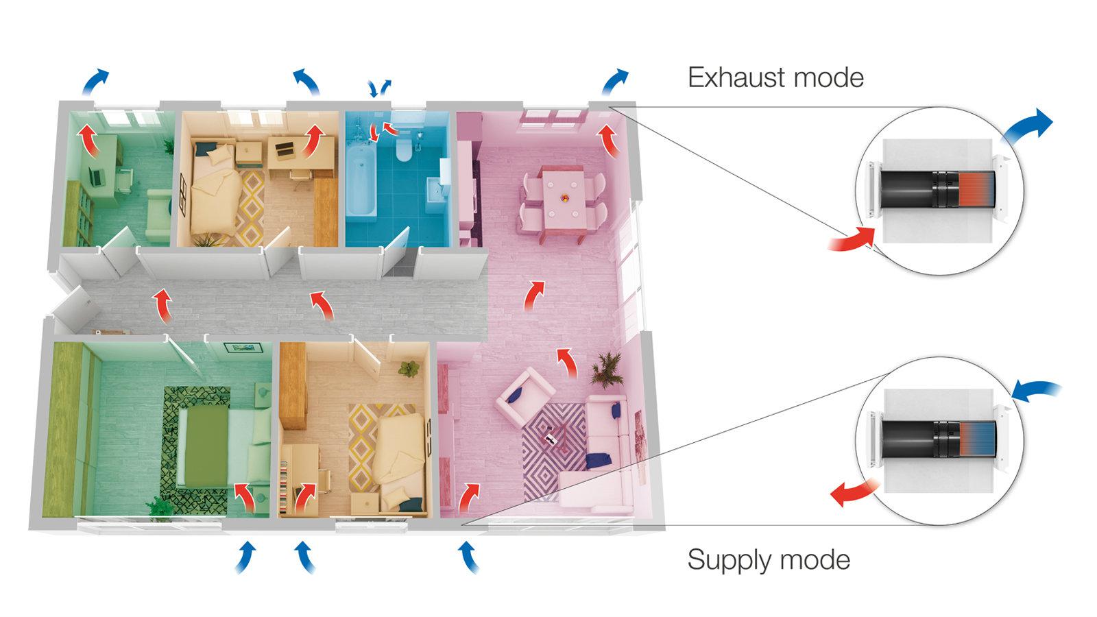 • Μετά από 70s ο ανεμιστήρας διπλής ροής, αντιστρέφει την κατεύθυνση του αέρα με αποτέλεσμα να εισάγει τον φρέσκο αέρα εντός της κατοικίας. Ο αέρας αυτός απορροφά την αποθηκευμένη θερμότητα του εναλλάκτη και προσάγει θερμό (χειμώνας) ή κρύο αέρα (καλοκαίρι) στην κατοικία μας, εξοικονομώντας ενέργεια από την θέρμανση ή ψύξη του χώρου.