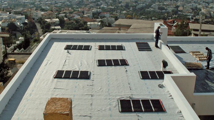 Διάστρωση υποστρώματος προστασίας & συγκράτησης υγρασίας ZinCo TSM32 Η επιφάνεια του δώματος στεγανοποιημένη με μεμβράνη αντιρριζικής προστασίας Διάστρωση εξειδικευμένων μηχανικών υποστρωμάτων ανάπτυξης