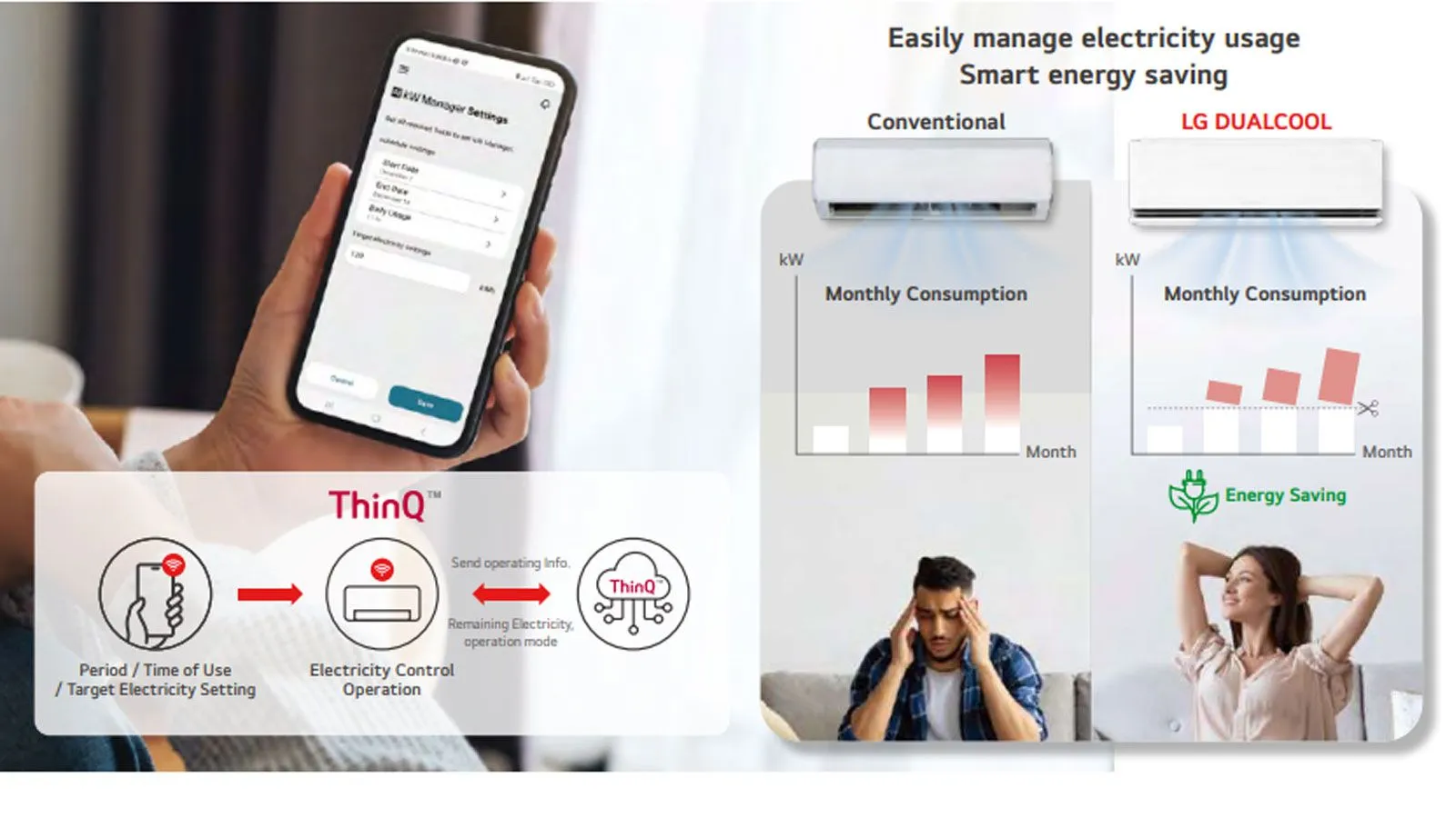 Ένα ακόμη σημαντικό εργαλείο είναι το kW Manager, το οποίο δίνει στον χρήστη τη δυνατότητα να ελέγχει και να περιορίζει την κατανάλωση ενέργειας. Μέσω της εφαρμογής ThinQ στο κινητό του μπορεί να ορίσει ανώτατα όρια κατανάλωσης (για συγκεκριμένα χρονικά διαστήματα), να παρακολουθεί τη χρήση σε πραγματικό χρόνο και να λαμβάνει ειδοποιήσεις όταν η συνολική κατανάλωση ξεπεράσει το όριο που έχει τεθεί. Αυτή η λειτουργία είναι ιδιαίτερα χρήσιμη σε περιόδους υψηλού ενεργειακού κόστους, καθώς επιτρέπει καλύτερο προγραμματισμό και αποφυγή υπερβολικών δαπανών.